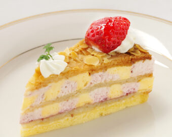 さっくり焼いたアーモンドたっぷりのジャポネ生地にクリームチーズとイチゴのムースを交互にサンドしました。