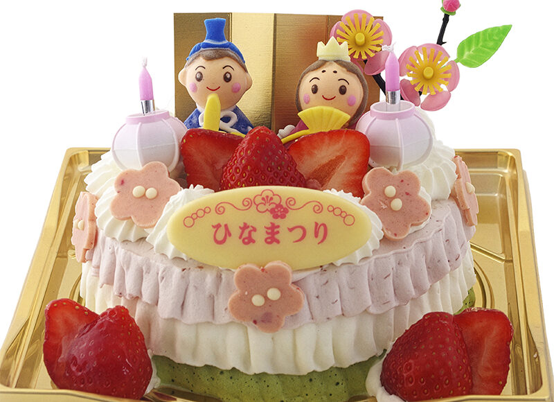 焼きたてのスポンジで自家製木苺のジャム、カスタードクリームを挟み、さらに旬のいちごをふんだんにサンドしています。ひし餅をイメージして自家製いちごソースをブレンドした生クリーム、八女茶の生クリームを重ねてデコレーション。